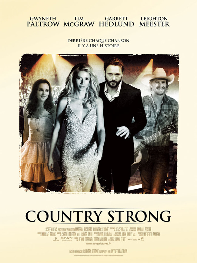 Je reviens sur ce film que j’ai vu il y a quelques semaines et qui m’avait pas mal plu. Country Strong est le deuxième film de la réalisatrice Shana Feste. Le casting est composé d’un quatuor d’acteurs/actrices. Deux confirmés en la personne de Gwyneth Paltrow et Tim McGraw. Et deux plus jeunes en la personne de Leighton Meester et Garrett Hedlund. Selon moi, la grande force du film réside dans ce casting car ils incarnent leur personnage à merveille. Brièvement, c’est l’histoire de Beau (Garrett Hedlund), un jeune chanteur prometteur, qui va développer une relation avec Kelly (Gwyneth Paltrow), une star de la chanson country sur le déclin et émotionnellement instable. Ils vont s’embarquer dans une tournée dans le but de relancer sa carrière. Dans cette aventure, ils seront accompagnés par Ed (Tim McGraw), le mari de Kelly, ainsi que Chiles (Leighton Meester), une ancienne reine de beauté devenue chanteuse.