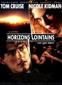 Horizons Lointains est l’un des rares films de la filmographie de Tom Cruise que je n’avais pas encore vu, en tout cas jusqu’à la semaine dernière. Il s’agit d’un film vieux de presque 20 ans signé Ron Howard, à qui l’on doit notamment Un Homme d’Exception ou encore De l’Ombre à la Lumière. Outre Tom Cruise, on retrouve également au casting Nicole Kidman pour ce qui est, à l’époque, leur deuxième film ensemble après Jours de Tonnerre 2 ans plus tôt. Concrètement, l’histoire du film se passe à la fin du 19 ème siècle en Irlande. Pour venger la mort de son père et l’incendie criminel de la ferme familiale, Joseph Donelly (interprété par Tom Cruise) s’introduit dans la demeure des Christie, responsables de son malheur. Il rencontre la ravissante Shannon (Nicole Kidman) qui le persuade de lui servir d’escorte pour le Nouveau Monde. Le jeune homme accepte. Commence alors pour eux une aventure pleine de rebondissements.