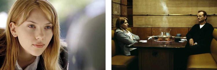 Mais si j’ai bien aimé ce film, c’est avant tout pour son jeu d’acteur qui est quand même phénoménale. En particulier celui de Bill Murray qui m’a complètement bluffé. Je ne connaissais pas particulièrement bien cet acteur et j’ai été totalement séduit par sa prestation. Son personnage est à la fois drôle et touchant. Drôle dans sa façon de se comporter avec les gens qui l’entourent. Je pense par exemple à la scène au début du film où il doit tourner le spot publicitaire pour le whisky. C’est une séquence très amusante car rien qu’en le regardant, on sent qu’il se demande franchement où il est tombé. Et également touchant par rapport au regard qu’il porte sur lui-même. Effectivement, dans ses nombreuses discussions, on sent qu’il est capable de prendre du recul et d’être critique vis-à-vis de son existence. A ses côtés, Scarlett Johansson s’en sort aussi très bien en livrant une prestation subtile et émouvante. C’est de loin l’un de ses plus beaux rôles à ce jour je trouve. Bref, vraiment rien à dire sur le casting qui était tout à fait à la hauteur.
