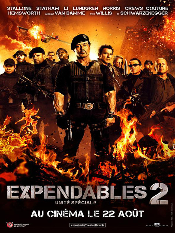 Lors d’une opération, apparemment sans danger, organisée par Church (Bruce Willis), Barney (Sylvester Stallone) et sa bande de mercenaires sont pris au piège par un dénommé Vilain (Jean-Claude Van Damme) qui tue l’un d’entre eux et s’enfuit avec leur butin. S’engage alors une véritable chasse à l’homme pour venger la mort de leur ami et laver l’honneur du groupe. Tel est le pitch de Expendables 2 réalisé par Simon West. A noter que le film réunit un casting assez somptueux en matière d’action puisque, hormis les acteurs précédemment cités et ceux qui étaient déjà présents dans le premier volet comme Jason Statham, Arnold Schwarzenegger ou encore Dolph Lundgren, on peut également retrouver Liam Hemsworth et surtout Chuck Norris.