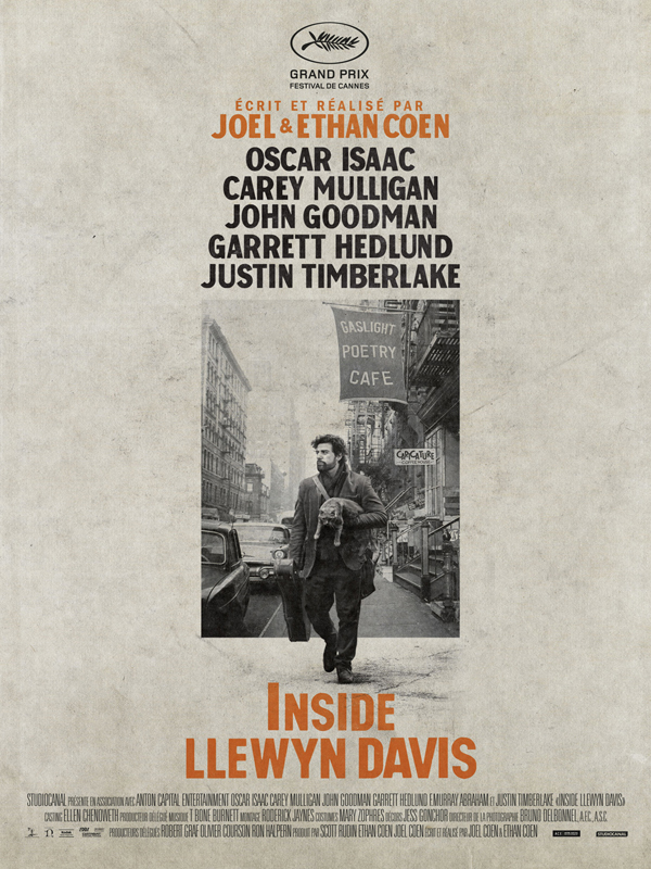Affiche fr inside llewyn davisRetour aujourd’hui sur Inside Llewyn Davis, le dernier film de Joel et Ethan Coen qui raconte une semaine de la vie de Llewyn Davis (Oscar Isaac), un jeune chanteur de folk dans le New York des années 60. Alors qu’un hiver rigoureux sévit sur la ville, le jeune homme, sa guitare à la main, lutte pour gagner sa vie comme musicien et affronte des obstacles qui semblent insurmontables, à commencer par ceux qu’il se crée lui-même. Il ne survit que grâce à l’aide que lui apportent des amis ou des inconnus, en acceptant n’importe quel petit boulot. Des cafés du village à un club désert de Chicago, ses mésaventures le conduisent jusqu’à une audition pour le géant de la musique Bud Grossman, avant de retourner là d’où il vient.