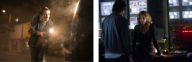 Après Prisoners l’année dernière, et Enemy il y a quelques mois, Jake Gyllenhaal poursuit sa formidable ascension en tant qu’acteur (une nomination aux Oscars ne serait pas volée) en livrant dans Night Call une nouvelle performance de haut vol. Fortement amaigri pour le rôle, le comédien incarne avec brio un personnage particulièrement complexe, à la fois sympathique, drôle et souriant ; mais aussi terriblement ambigu, cynique et ambitieux. Le genre de personnage prêt à tout pour arriver à ses fins et qui ne semble animé d’absolument aucun remords. Plus le film avance, et plus il se dévoile, révélant progressivement une détermination aussi extrême que glaçante. Moralement douteux, le personnage suscite néanmoins, grâce au jeu impeccable de Jake Gyllenhaal, suffisamment d’empathie que pour le suivre dans ses péripéties pendant toute la durée du film. Et si son incursion dans l’univers du journalisme est plutôt amusante au départ, elle bascule rapidement dans le glauque au fur et à mesure des reportages, toujours plus choc et toujours plus à la limite de la légalité. Le long-métrage a toutefois la bonne idée de ne jamais juger le héros, et évite ainsi un côté moralisateur qui aurait certainement amoindri l’impact du récit.