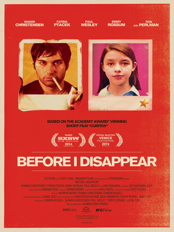 Je reviens aujourd’hui sur un film que je ne connaissais absolument pas et que j’ai découvert un peu par hasard il y a quelques semaines. Il s’agit de Before I disappear, une comédie dramatique de Shawn Christensen (Richie) dans laquelle il partage l’affiche avec Fatima Ptacek (Sophia), Emmy Rossum (Maggie), Paul Wesley (Gideon) et Ron Perlman (Bill). Adapté du court-métrage Curfew – que Shawn Christensen avait déjà écrit, produit et réalisé, et pour lequel il avait d’ailleurs remporté un Oscar -, Before I disappear raconte le quotidien difficile de Richie. Un jour, alors qu’il tente de mettre fin à ses jours, il reçoit un coup de téléphone de sa sœur, Maggie, lui demandant de garder sa nièce, Sophia, pour quelques heures.