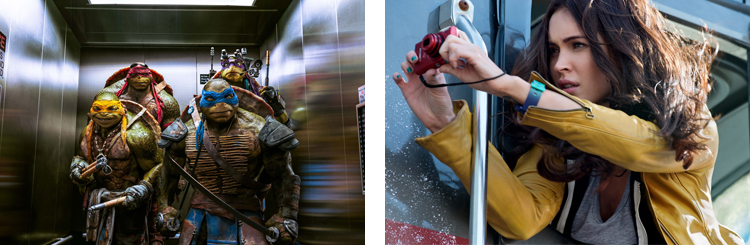 Ensuite, l’autre grande force de l’adaptation réside selon moi dans son aspect visuel travaillé, un point qui contraste nettement avec la relative pauvreté du script. Les effets spéciaux sont en effet de très bonne qualité et nous offrent quelques scènes d’action aussi impressionnantes que délirantes. J’en veux par exemple pour preuve toute la séquence de glissade à la montagne, qui nous emporte dans une chute vertigineuse comprenant les deux ingrédients phares du film : de l’action et de l’humour. A ce titre, il faut d’ailleurs souligner la mise en scène tout à fait correcte du réalisateur qui, si elle ne transcende pas littéralement le projet, dynamise tout de même efficacement la plupart des séquences. Et le constat est identique pour les ralentis dont l’utilisation apporte indéniablement quelque chose en plus aux scènes, en nous permettant notamment d’apprécier encore davantage les acrobaties des tortues. Enfin, il est assez difficile de se prononcer sur les acteurs puisque les personnages manquent tellement de finesse et de développement qu’ils n’ont pas forcément grand-chose à interpréter. Disons simplement que Megan Fox fait du Megan Fox, et le fait plutôt bien.