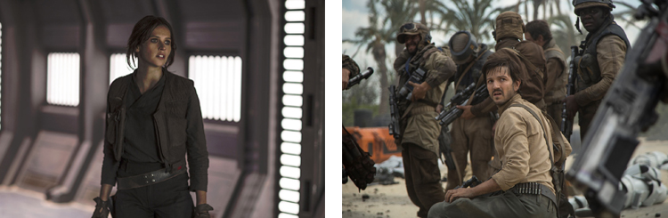 Si le script s’avère particulièrement efficace dans sa capacité à brosser une histoire qui tient la route à partir d’une simple phrase lâchée au début de l’épisode IV, il souffre en effet grandement de son statut de spin-off. Ainsi, malgré toute la bonne volonté des scénaristes pour s’éloigner du schéma classique des films Star Wars, l’issue est connue dès le départ et le long-métrage finit donc inévitablement par faire – de très belle façon il faut l’avouer – la jonction avec l’épisode suivant. Le récit dans sa globalité n’en pâtit pas réellement, celui-ci se révélant plutôt agréable et enlevé malgré les nombreuses ficelles, mais on ne peut malheureusement pas en dire autant des personnages. Hormis l’héroïne Jyn (interprétée par Felicity Jones), qui bénéficie notamment d’une relation intéressante avec son père Galen (Mads Mikkelsen), tous les personnages manquent cruellement d’épaisseur, échouant de ce fait à susciter un véritable attachement. Et c’est d’autant plus regrettable que leur trajectoire finale vaut pourtant le détour.
