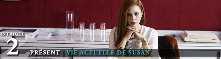 intrigue-1Alors qu’elle travaille à New York, Susan tombe nez à nez avec Edward, qu’elle a côtoyé plus jeune lorsqu’elle étudiait au Texas. Lors d’un dîner, ils s’avouent mutuellement leurs sentiments respectifs. C’est le début d’une belle histoire d’amour. Contre l’avis de sa mère (superbe Laura Linney), qui juge Edward faible et inférieur à elle, Susan l’épouse. Petit à petit, le mariage commence néanmoins à se dégrader. Jusqu’au jour où elle remet en cause le talent d’écriture d’Edward, estimant que son ouvrage est trop personnel. Devant la réaction défensive de son mari, elle se réfugie derrière son côté réaliste et son manque de créativité. Mais le mal est déjà fait, elle sonne désormais comme sa propre mère. Plus tard, Susan quitte Edward pour Hutton, un jeune bourgeois rencontré lors de l’un de ses cours. En sa compagnie, elle avorte du bébé d’Edward, qui les surprend tous les deux à la sortie de la clinique.