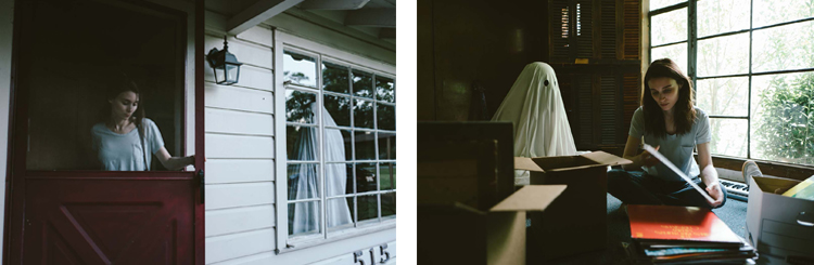 Projeté en 4/3 dans un cadre doté de contours arrondis, le film séduit immédiatement par sa somptueuse photographie. Sous ses allures vintage, celle-ci nous plonge effectivement dans une époque semblant totalement perdue dans le temps, faisant écho au propos du récit sans jamais toutefois prendre le pas sur le fond. A grands coups de plans fixes et interminables, le cinéaste insuffle à son œuvre une atmosphère absolument incomparable, vectrice d’émotions subtiles et intenses. Certes, les premières minutes du film peuvent se révéler déroutantes pour tout un chacun, mais l’expérience proposée est particulièrement riche dès lors qu’on rentre véritablement dans l’histoire. A ce titre, la scène qui voit le personnage de Rooney Mara engloutir entièrement une tarte pour noyer son chagrin est parfaitement représentative du film : une scène longue et éprouvante mais d’une puissance émotionnelle rare. Enfin, pour conclure sur la dimension technique, le choix, un peu cliché au départ, du fantôme vêtu d’un drap blanc avec deux trous pour les yeux s’avère au final incroyablement judicieux, tant sur le plan purement esthétique (les images sont superbes) que dans l’optique de véhiculer des émotions fortes (mélancolie, tristesse, nostalgie…) en s’y attardant.
