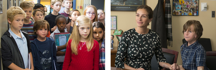 Pour autant, toutes les scènes ne bénéficient pas de la subtilité nécessaire pour appuyer efficacement le beau message du film. Entre les quelques ficelles qui jalonnent le récit et l’excès de pathos de certaines séquences, l’ensemble manque parfois un peu de retenue, surlignant inutilement ses effets là où un peu de finesse aurait, au contraire, renforcer l’impact général. A moins d’être totalement allergique aux bons sentiments, le tout reste cependant très correct, surtout compte tenu du public visé. Si le film sonne juste la plupart du temps, c’est également grâce à l’interprétation convaincante des acteurs, enfants comme adultes. Plus que Jacob Tremblay, quasiment méconnaissable sous ses prothèses faciales, c’est surtout ici Julia Roberts qui émeut par la dévotion incroyable dont elle fait preuve. A ses côtés, on retiendra aussi la prestation pleine de sensibilité de la jeune Izabela Vidovic, et celle tout en authenticité de Noah Jupe. Tandis qu’Owen Wilson assure, de son côté, avec succès la touche humoristique du long-métrage, l’empêchant de sombrer plus que de raison dans le mélo.