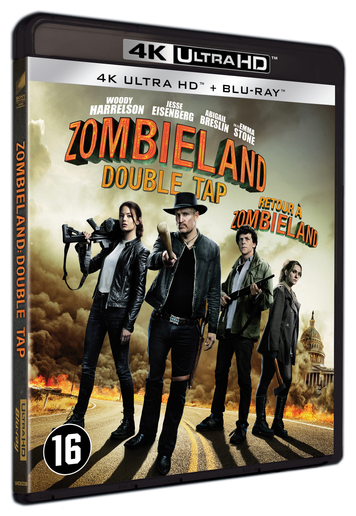 Bien qu’il s’agisse en réalité d’un master intermédiaire supervisé en 2K, le disque Blu-ray 4K Ultra HD de Retour à Zombieland propose néanmoins de très belles images. Totalement dépourvues de grain, celles-ci séduisent principalement par leur définition, sinon chirurgicale, tout de même extrêmement aboutie. Des visages aux cheveux, en passant par les costumes et les décors, l’ensemble des éléments présents à l’écran profitent en effet d’une précision assez remarquable. Fort de sa technologie HDR, le disque renforce aussi de façon spectaculaire les contrastes, déjà superbes à la base. Côté audio, le Blu-ray met à disposition une piste VO DTS-X (DTS‑HD Master 7.1) très convaincante. Sans forcément atteindre des sommets démonstratifs, elle bénéficie effectivement d’un mixage sonore excessivement solide, faisant la part belle aux bruitages en tout genre. A ses côtés, la VF en DTS-HD Master 5.1 ne démérite certainement pas, mais affiche toutefois un léger manque de relief. Enfin, les deux disques du boîtier complètent l’offre vidéo avec une multitude de bonus divers et variés (commentaires, scènes alternatives, making of…). De quoi raisonnablement prolonger l’expérience de visionnage !